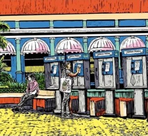 Rodríguez’s images wipe away the worst struggles of the city and show off the iconic structures and places that make us proud to be josefinos. Somehow, the scrubbly look of her prints captures the imperfect nature of the scenes, such as this one featuring the public phones downtown that I used to search for a job during my first days in Costa Rica in 2004. (Yes. With a phone card. As my daughter says, “Those were days of yore.”) This was my office: